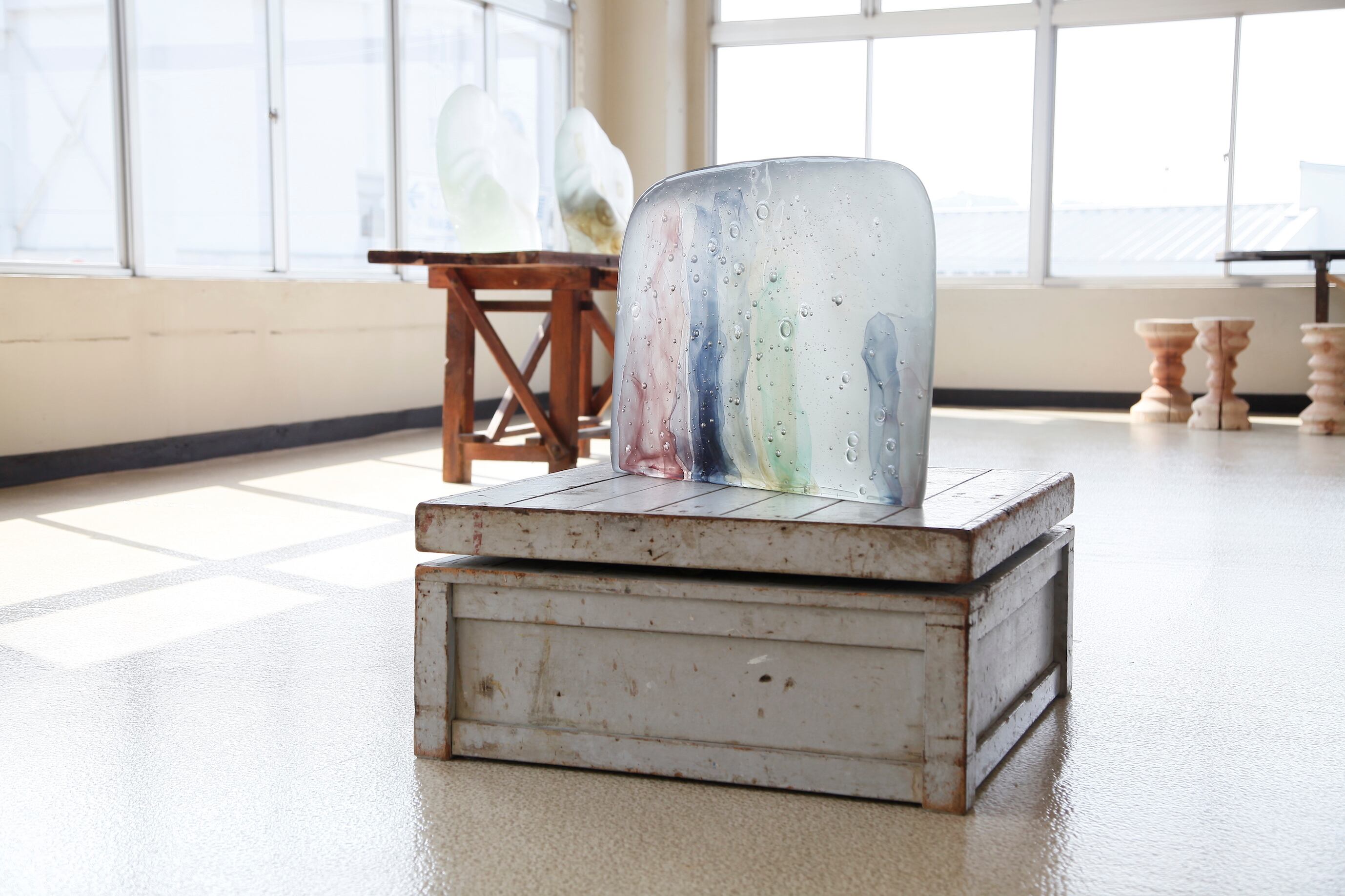 鋳造技法、キルンワークによるオブジェ 「いろも」と呼ぶ サイズ|W 680×H480×D190 (mm) 重量|70kg 素材|ガラス(無垢) 金額|応相談 / ご興味ありましたらお問合せください 送料|梱包方法により変化します